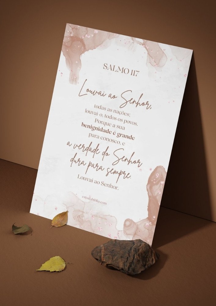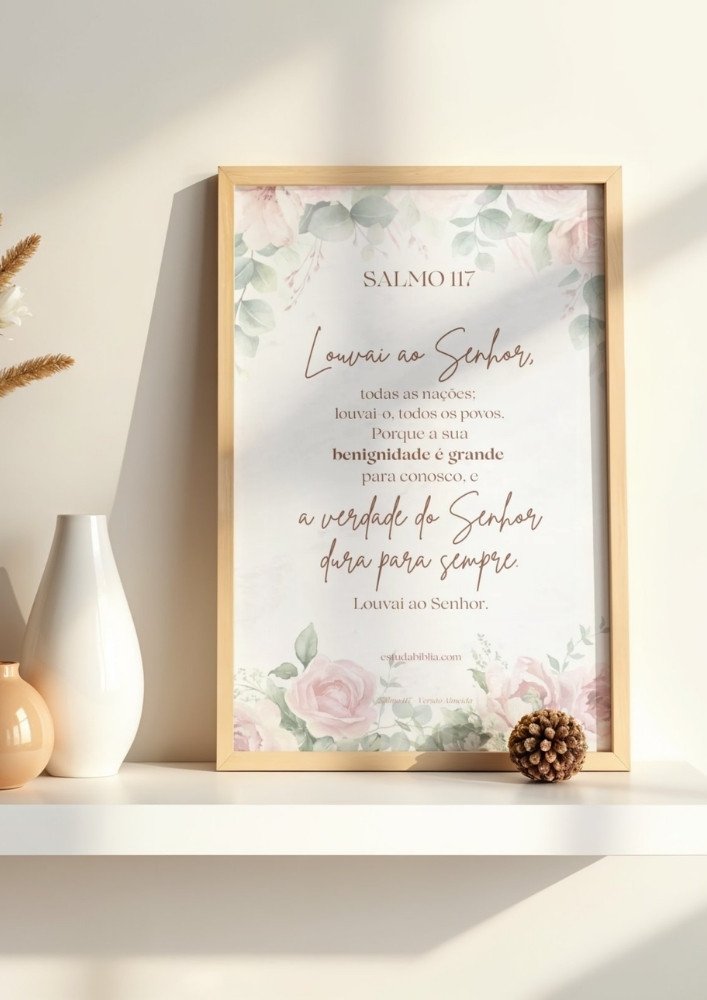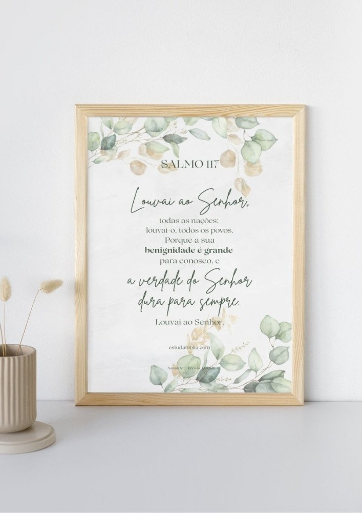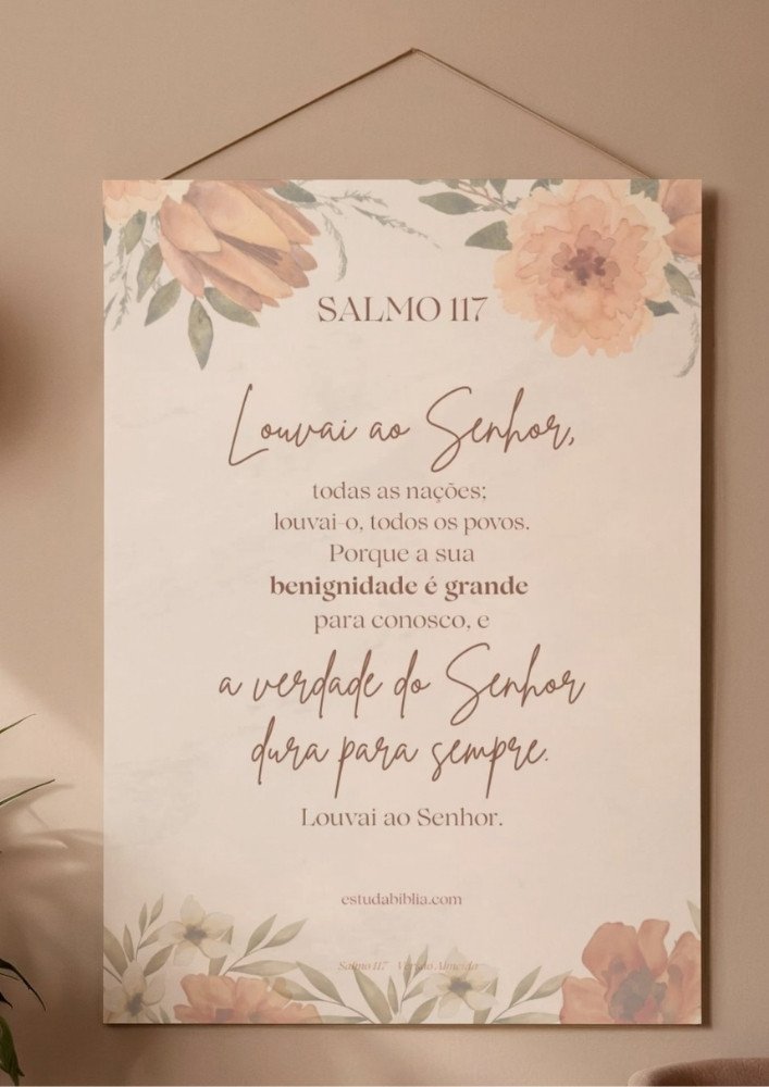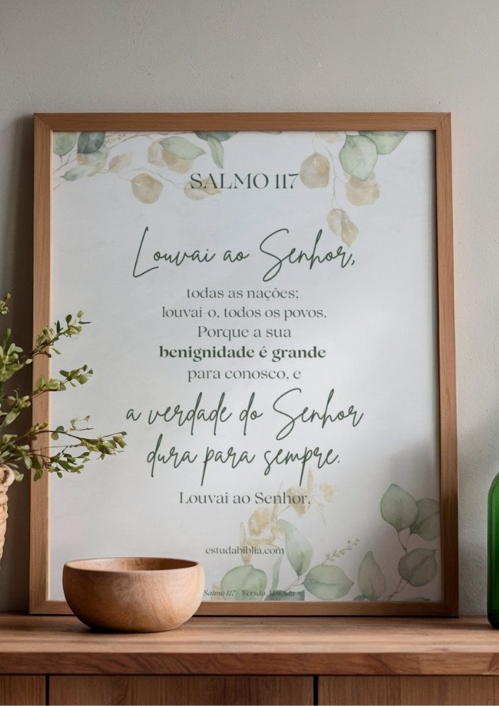 Este arquivo pode ser impresso e utilizado no cantinho de oração, na Bíblia, em encontros de fé ou momentos de meditação pessoal. O Salmo 117 para imprimir é um Produto digital inclui arquivo em formato PDF no tamanho A3 compatível com tamanho A4, não inclui produto físico ou molduras. ideal para quem busca uma oração breve, acessível e cheia de significado para o dia a dia.